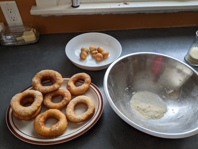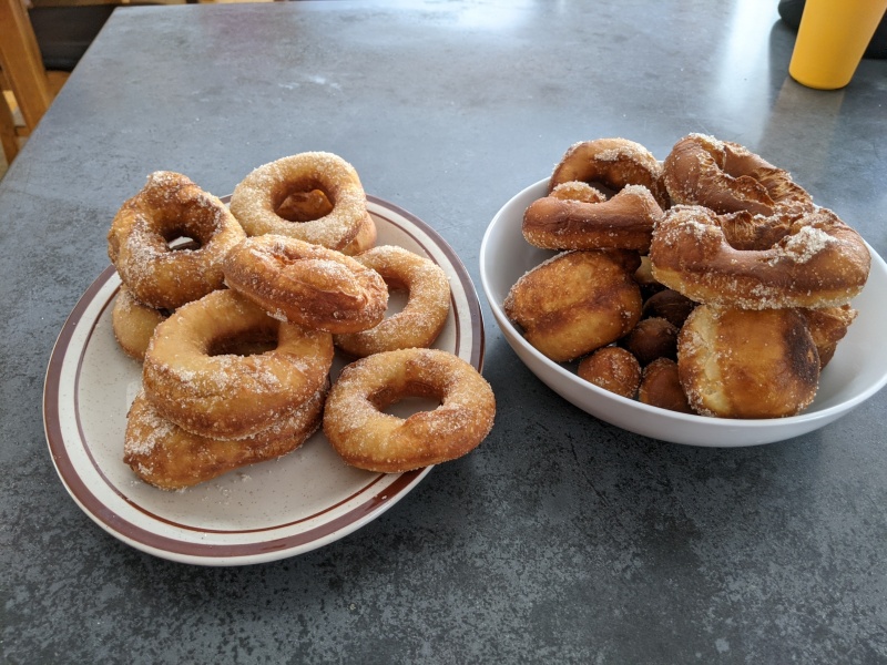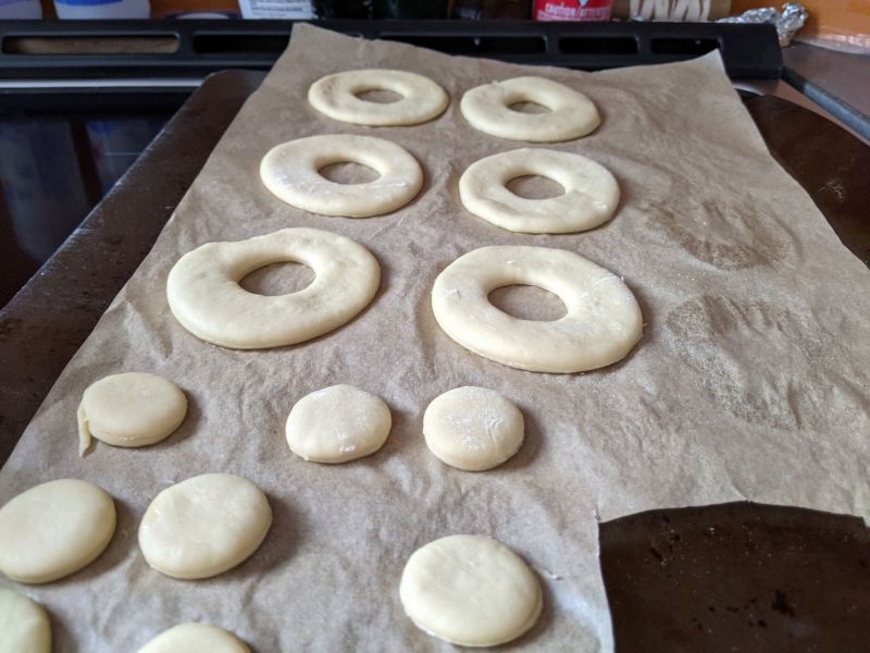 Roll out to thickness of 5-7mm, or make balls that are ~60-80g and flattened. Big glass + shot glass for donuts…