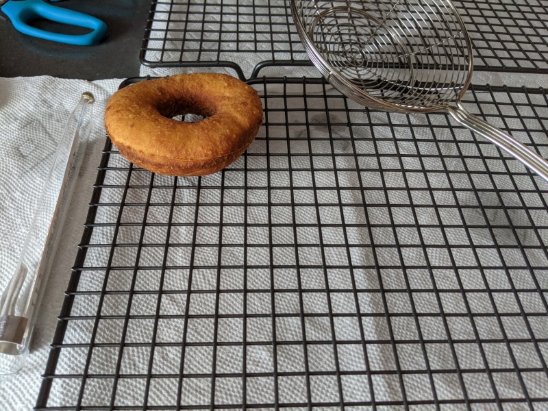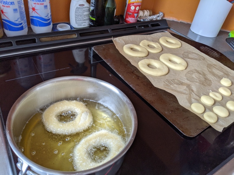 Place (back) in the fridge for 30min as you prepare the oil, ~350F. Cooling them down makes them slightly less super difficult to pick up. Place in the oil with the side that was proofing on top downwards, into the oil (i.e. flip them). 90 seconds on each side.