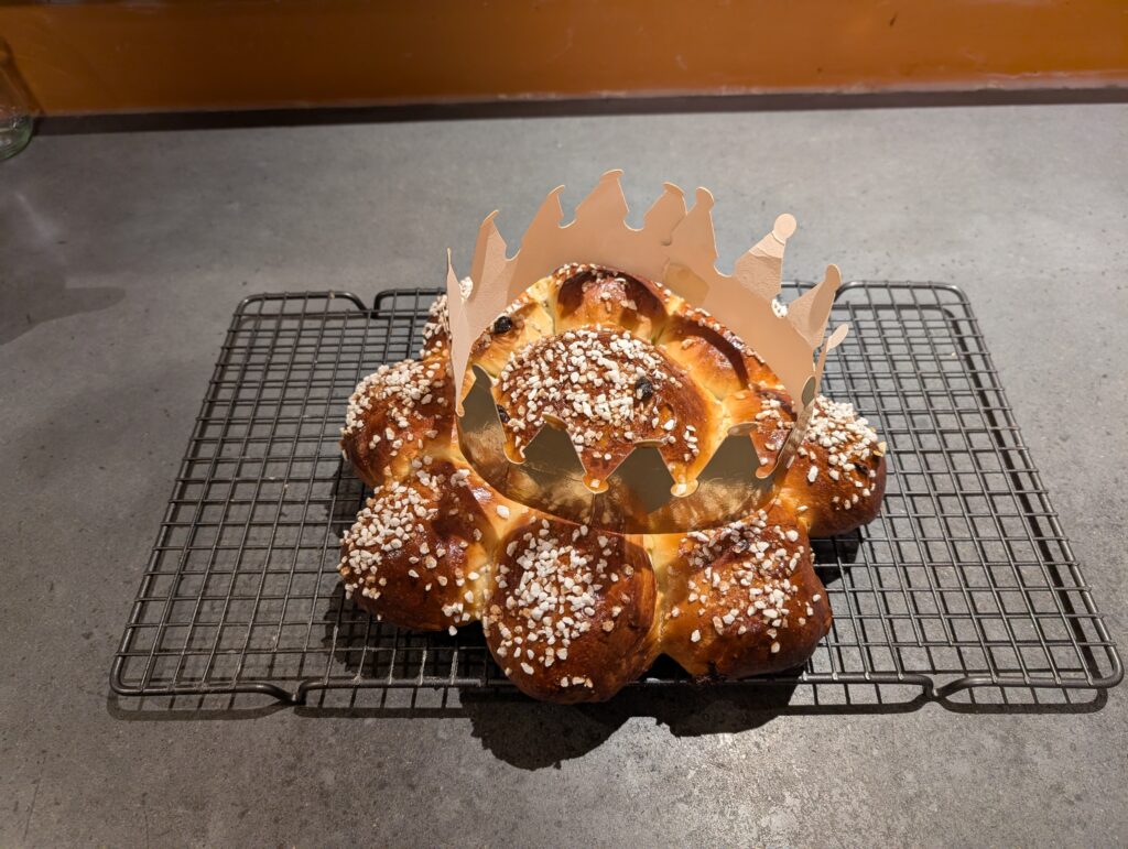 Prendre un quart de la pâte et faire une grosse boule. Faire 8 autre petites boules avec le reste de la pâte et disposer autour de la grosse sur du papier cuisson. Mettre une fève amande entière dans une des petites boules. Recouvrir d’un papier cuisson et laisser reposer 30 minute.